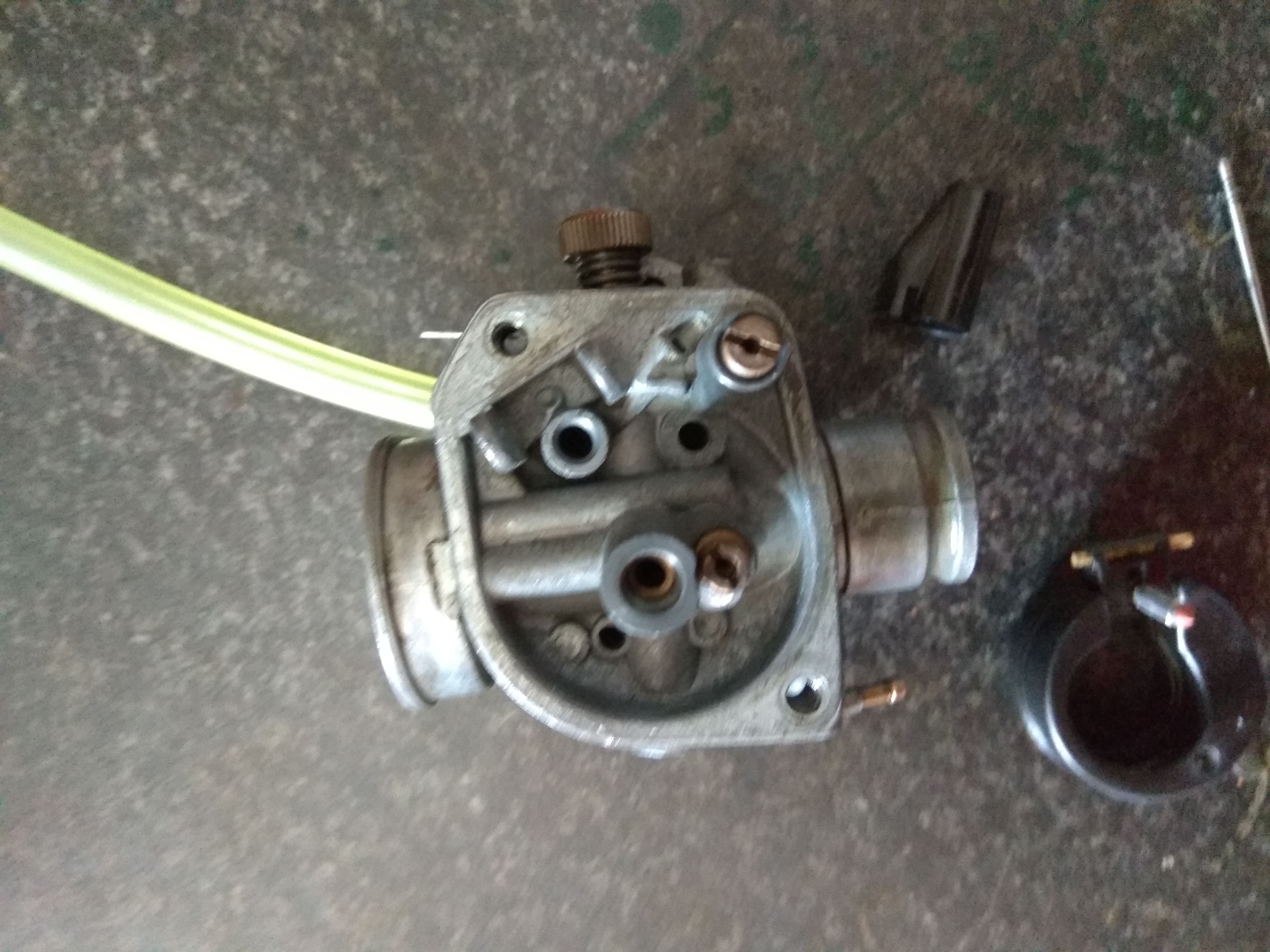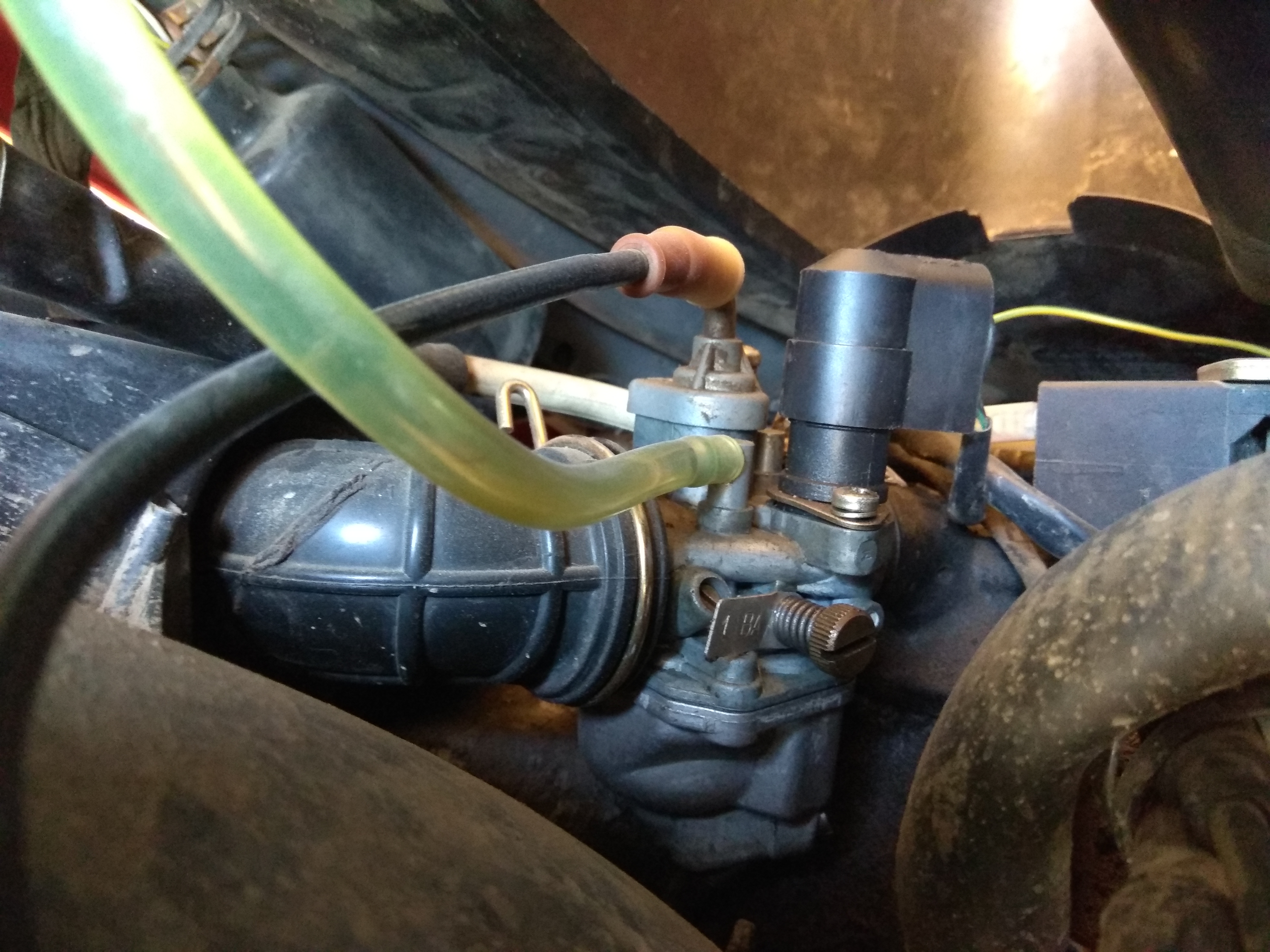 Primeramente la moto no arrancaba así que como parecía que la gasolina no bajaba pense que era el carburador que estaba obstruido y por ello no le llegabe gasolina, me puse manos a la obra y tras unas cuantas fotos para no equivocarme al montarlo lo saque, y vi que el al dar gas no se abría bien asi que depues de soplar los chicles y limpiarlo con gasolina lo monté, y la moto arrancaba pero ni se quedaba mucho rato arrancada ni se movía así que la deje un tiempo sin tocarla.